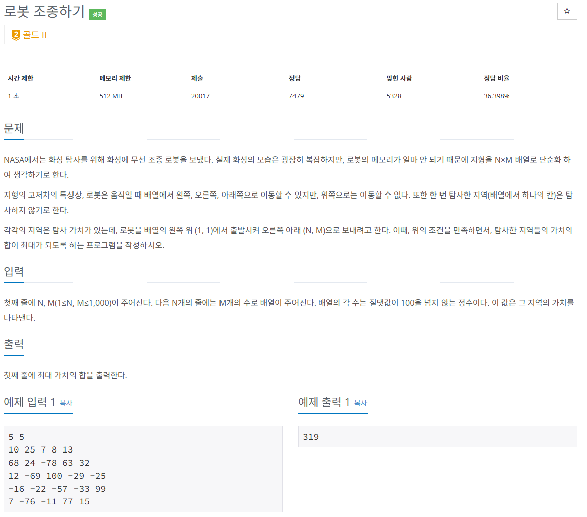 로봇은 아래, 왼쪽, 오른쪽으로만 이동할 수 있으므로 한 row에 대해서 왼쪽에서 오는 경우, 오른쪽에서 오는 경우를 저장해서 둘 중 큰 값을 dp에 저장하는 방식으로 해결하였다.