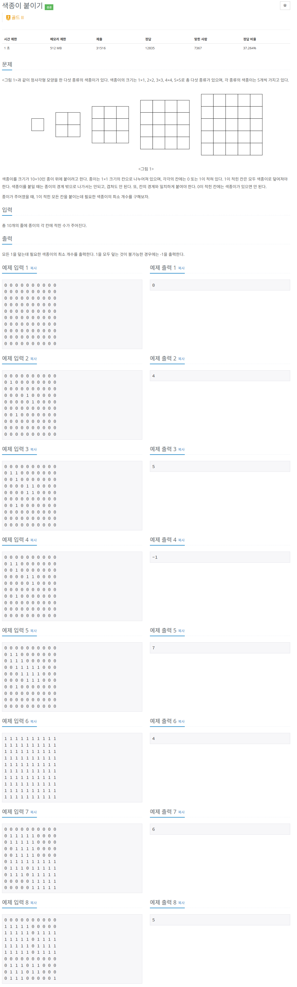 좌측상단에서 처음 1이 나오는 위치를 찾는다. 그리고 그 위치부터 크기가 5인 색종이부터 붙인다. 한 종류의 색종이의 개수가 5를 넘거나 더 이상 붙일 수 없으면 색종이의 크기를 1 줄여서 탐색한다. 이 경우 항상 최소개수를 만족하게 된다.