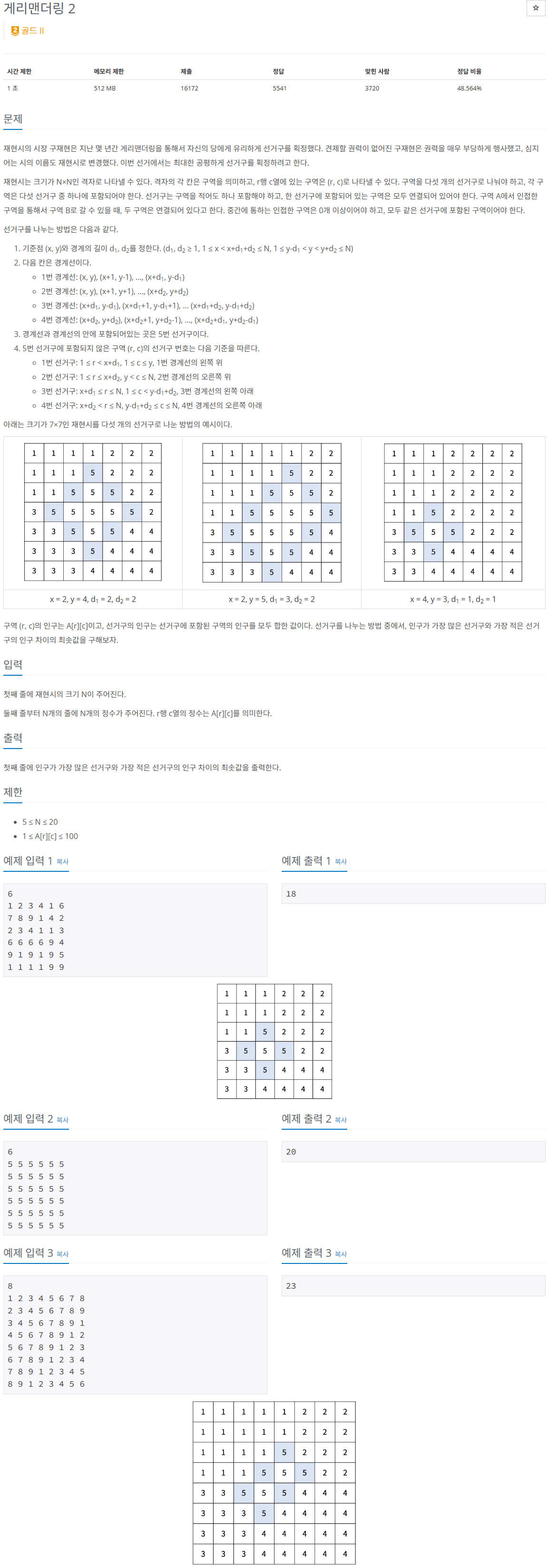 범위를 만족하는 모든 x, y, d1, d2의 경우에 대해, 각 케이스마다 구역을 나눈 뒤 인구수 차이를 구하고, 최종적으로 그 값의 최솟값을 구하면 된다.