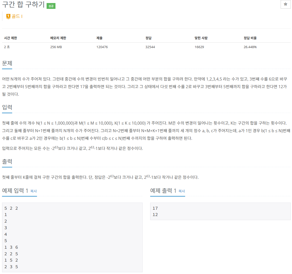 구간합을 계산할 때는 합 세그먼트 트리를 생성한 다음, 이전에 풀었던 최솟값 최댓값 구하는 로직과 똑같이