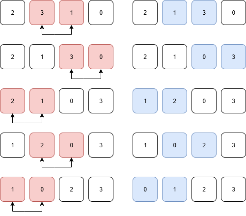 이렇게 되면 처음 배열 [2,3,1,0]에서 2는 1과 0, 3은 1과0, 1은 0과 교체해야 한다.