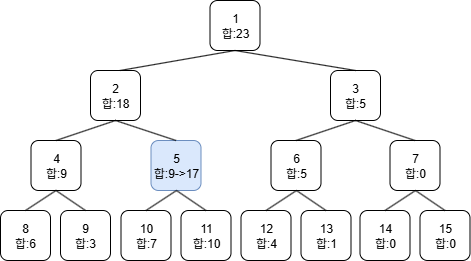 이제 왼쪽 자식노드와 오른쪽 자식노드의 값을 가지고 부모노드의 값을 업데이트해준다.