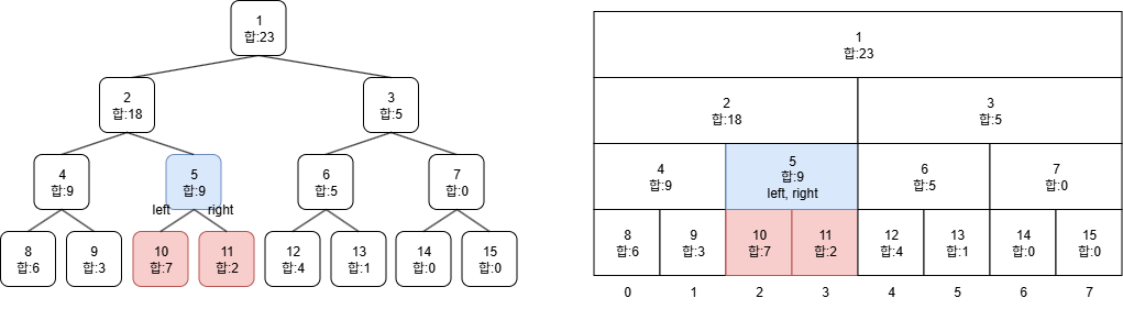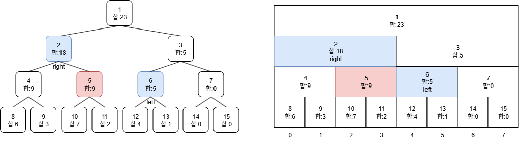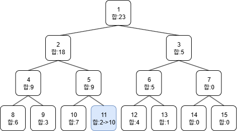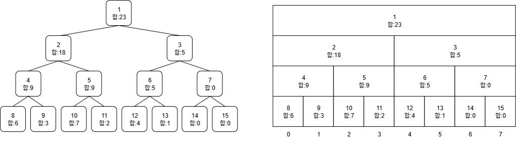 # 합 세그먼트 트리이므로 부모노드는 왼쪽 자식노드 + 오른쪽 자식노드의 합