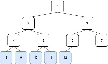 이 트리는 리프노드 8,9,10,11,12를 제외한 모든 노드들의 자식노드가 2개씩 있고 왼쪽부터 채워져 있으므로 이진트리이다.