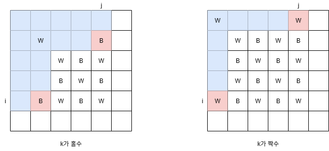여기서 주의할 점은 k가 홀수이면 제외되는 부분의 끝이 i, j 칸의 색과 달라야 하고, k가 짝수라면 같아야 한다.
