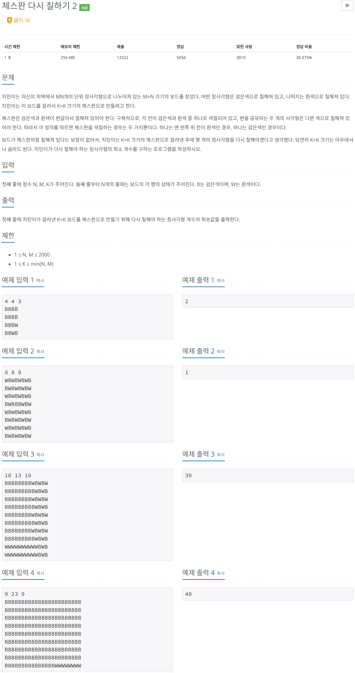 n*m크기의 체스판을 k*k크기로 나누었을 때 각 칸을 체스판 형태로 만들려고 한다. 이때 색을 칠하는 횟수의 최솟값을 구하는 문제이다.