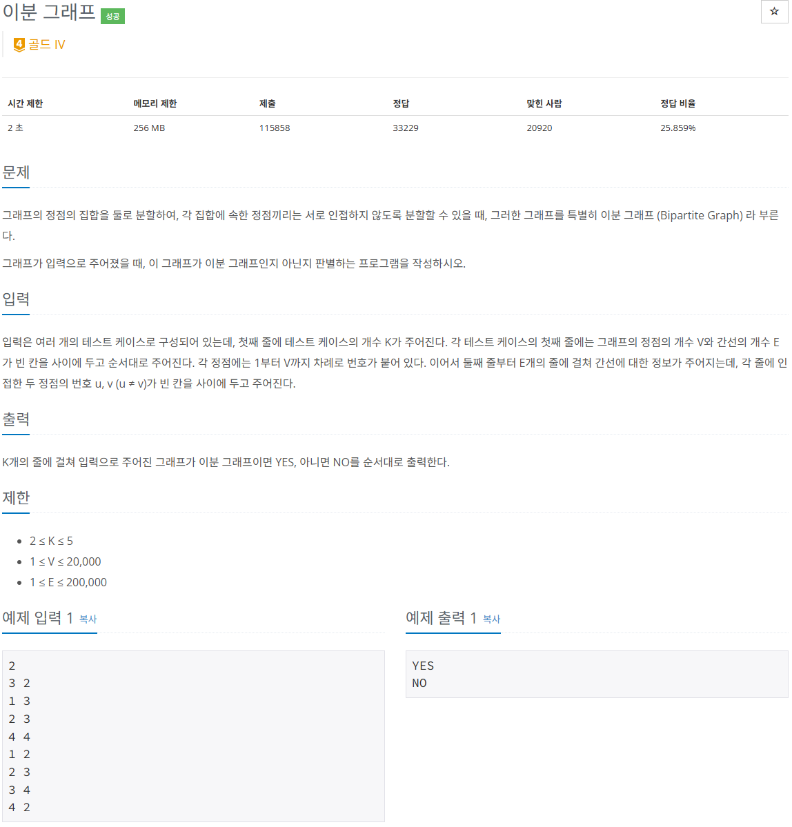 예제 입력의 두번째 케이스는 3번과 4번 정점이 같은색으로 칠해진다. 이분 그래프가 아니다.
