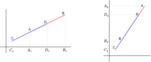 따라서 선분AB의 왼쪽점인 \(A_{x}\)가 선분 CD의 오른쪽 점인 \(D_{x}\) 보다 작아야한다.