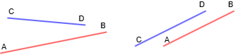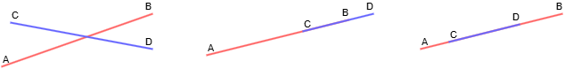 점 A, 점 B를 양 끝으로 하는 선분 AB와 점 C, 점 D를 양 끝으로 하는 선분 CD가 최소 1개 이상의 공통점을 가지는 경우를 두 선분이 교차한다고 말한다.