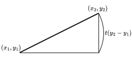 마찬가지로 y좌표는 \( y = y_{1}+t(y_{2}- y_{1}),0\leq t\leq 1\) 으로 표현할 수 있다.