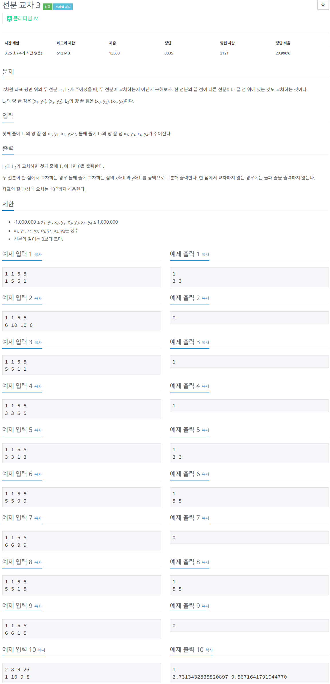 두 선분의 교차 여부와, 교점이 1개일때 그 교점의 좌표를 구하는 문제이다.