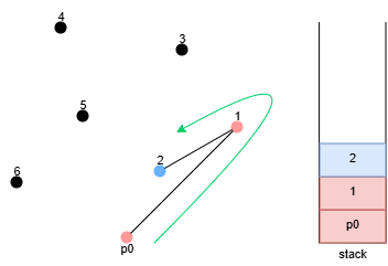 이렇게 모든 점을 순회하게 되면 스택에 남는 점은 [시작점, 1, 3, 4, 6] 이 된다.