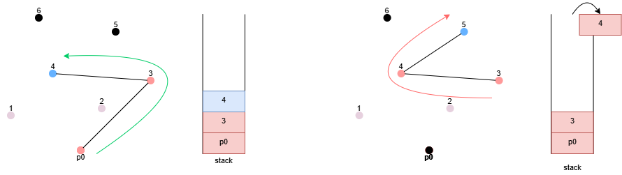 스택의 상위 2개와 4번점은 CW이므로 스택에서 하나를 꺼내준다.