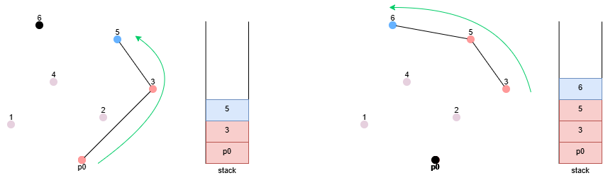 4. 모든 점들을 순회하면서 스택의 상위 2개의 점과 현재 선택된 점의 외적을 구한다. CCW라면 스택에 넣어주고, CW라면 스택에서 1개를 제거한다. CCW가 나올때까지 이 단계를 반복한다.