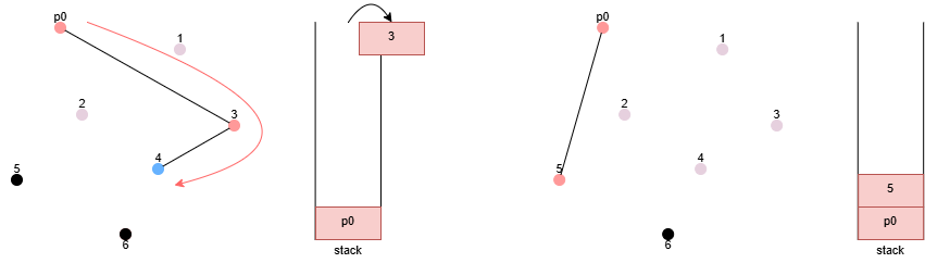 스택의 상위 2개와 4번점은 CCW이므로 스택에 넣어준다.
